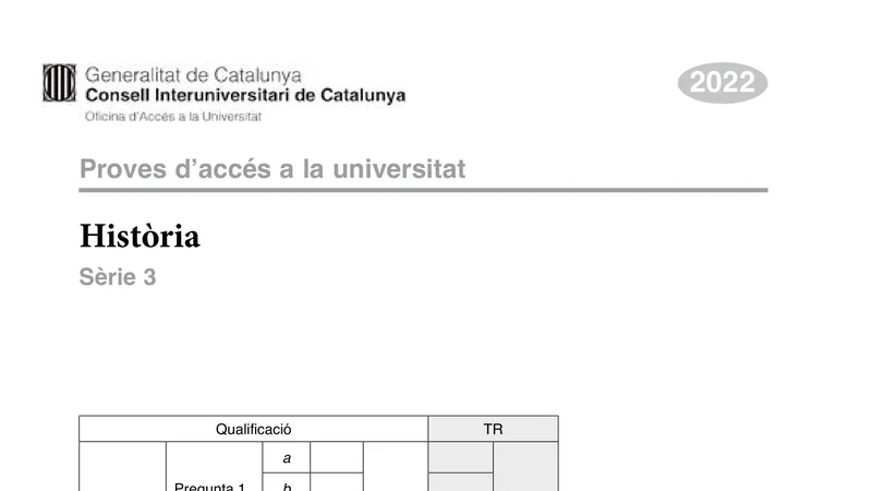 Enunciado oficial del examen de Historia de España de la convocatoria extraordinaria de 2022 de la PAU de Cataluña. PDF de 0.2 MB. Descarga gratuita y sin registro. ¿Preparando la selectividad? Calcula tu nota estimada o consulta la guía completa de selectividad 2026. Encuentra todos los exámenes de Historia de España en Cataluña o explora las 17 comunidades autónomas.