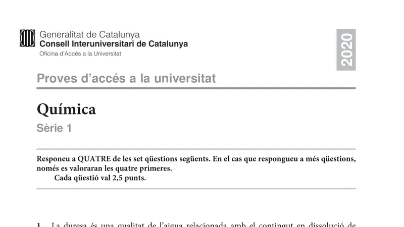 Examen PAU Química selectividad Cataluña — Ordinaria 2020