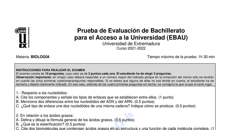 Reservar clase gratis →Examen de Biología selectividad Extremadura (Extraordinaria 2022)