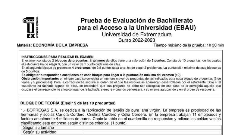 Examen PAU Economía selectividad Extremadura — Ordinaria 2023