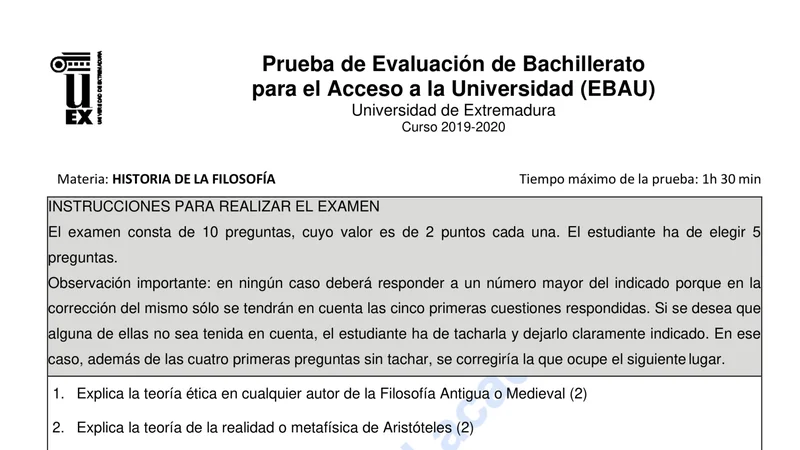 Examen de Historia de la Filosofía selectividad Extremadura — Ordinaria 2020
