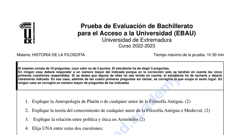 Examen de Historia de la Filosofía selectividad Extremadura (Ordinaria 2023)