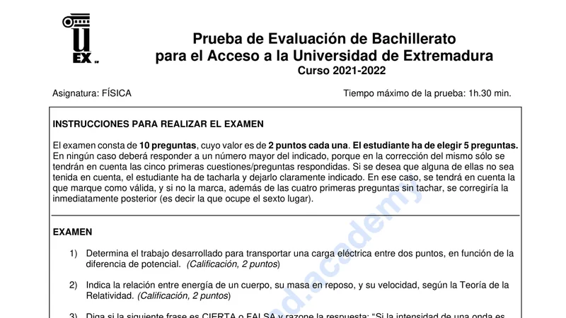 Enunciado oficial del examen de Física de la convocatoria extraordinaria de 2022 de la EBAU/PAU de Extremadura. PDF de 0.2 MB. Descarga gratuita y sin registro. ¿Preparando la selectividad? Calcula tu nota estimada o consulta la guía completa de selectividad 2026. Encuentra todos los exámenes de Física en Extremadura o explora las 17 comunidades autónomas.