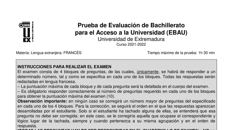 Reservar clase gratis →Examen de Francés selectividad Extremadura (Ordinaria 2022)