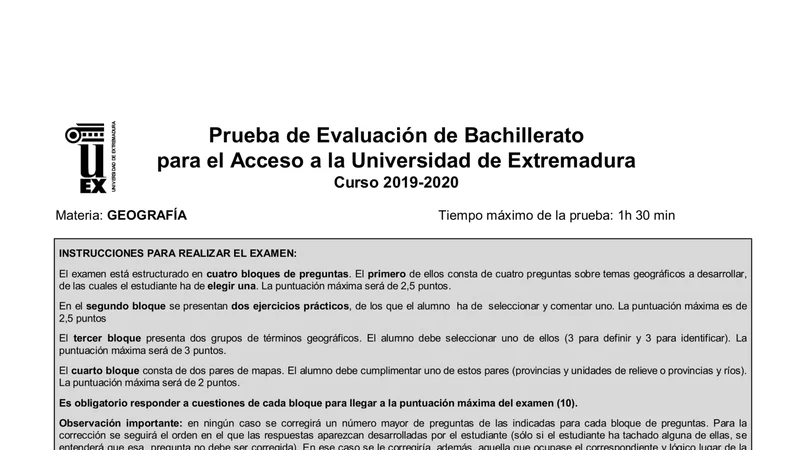 Examen PAU Geografía selectividad Extremadura — Ordinaria 2020