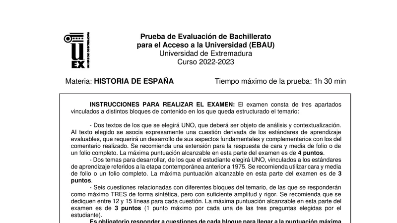 Examen de Historia de España selectividad Extremadura — Ordinaria 2023