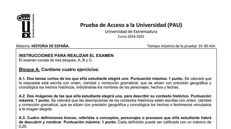Reservar clase gratis →Examen de Historia de España selectividad Extremadura (Ordinaria 2025)