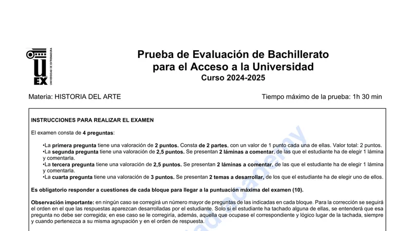 Reservar clase gratis →Examen de Historia del Arte selectividad Extremadura (Ordinaria 2025)