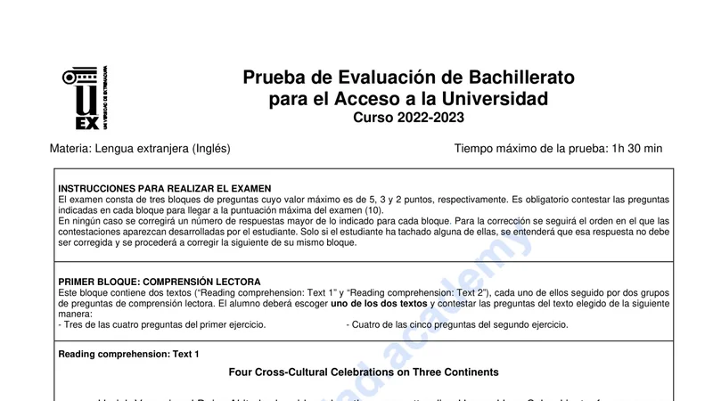 Enunciado oficial del examen de Inglés de la convocatoria extraordinaria de 2023 de la EBAU/PAU de Extremadura. PDF de 0.0 MB. Descarga gratuita y sin registro. ¿Preparando la selectividad? Calcula tu nota estimada o consulta la guía completa de selectividad 2026. Encuentra todos los exámenes de Inglés en Extremadura o explora las 17 comunidades autónomas.