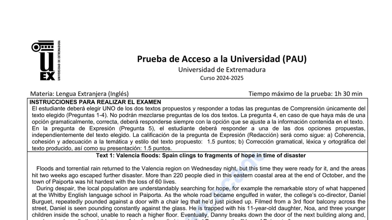 Enunciado oficial del examen de Inglés de la convocatoria extraordinaria de 2025 de la EBAU/PAU de Extremadura. PDF de 0.3 MB. Descarga gratuita y sin registro. ¿Preparando la selectividad? Calcula tu nota estimada o consulta la guía completa de selectividad 2026. Encuentra todos los exámenes de Inglés en Extremadura o explora las 17 comunidades autónomas.