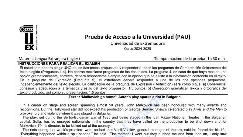 Examen PAU Inglés selectividad Extremadura — Ordinaria 2025