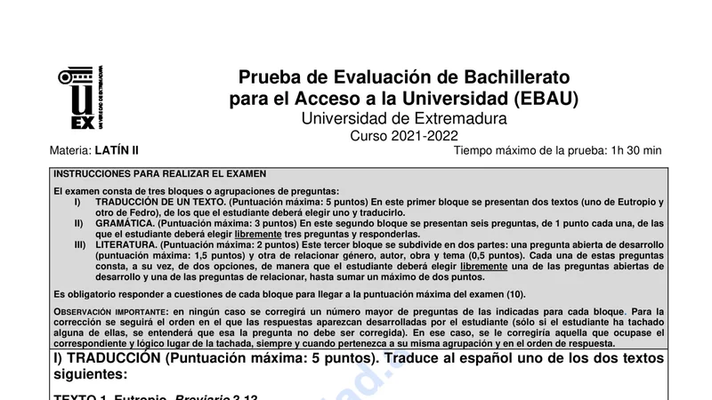 Enunciado oficial del examen de Latín II de la convocatoria extraordinaria de 2022 de la EBAU/PAU de Extremadura. PDF de 0.2 MB. Descarga gratuita y sin registro. ¿Preparando la selectividad? Calcula tu nota estimada o consulta la guía completa de selectividad 2026. Encuentra todos los exámenes de Latín II en Extremadura o explora las 17 comunidades autónomas.