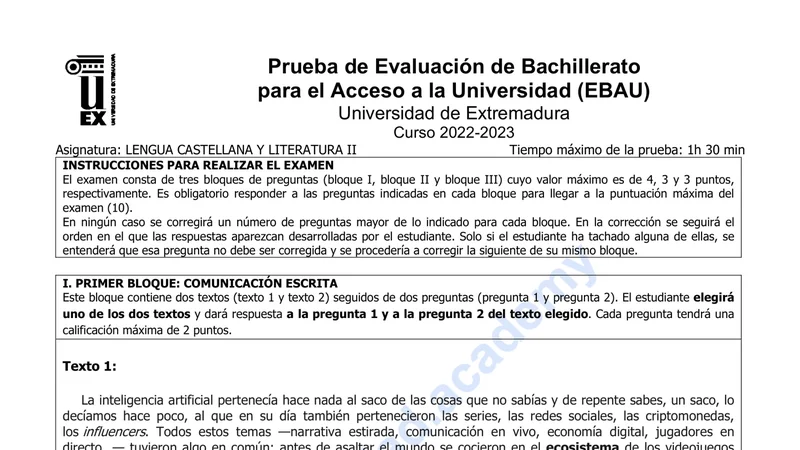 Reservar clase gratis →Examen de Lengua Castellana selectividad Extremadura (Extraordinaria 2023)