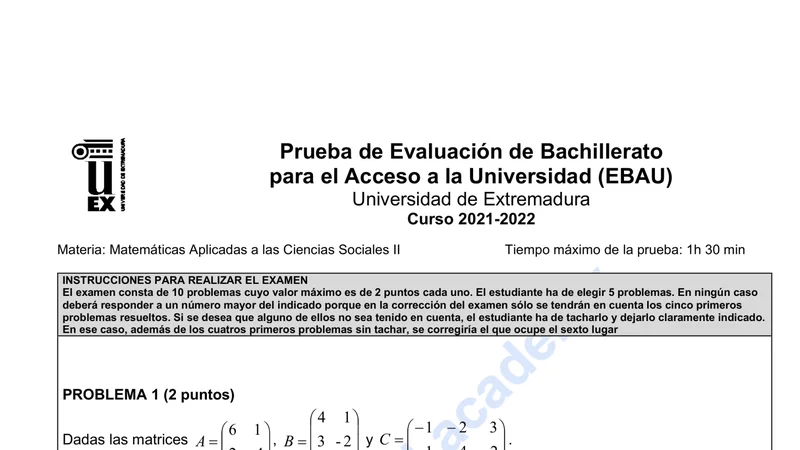 Reservar clase gratis →Examen de Matemáticas CCSS selectividad Extremadura (Extraordinaria 2022)