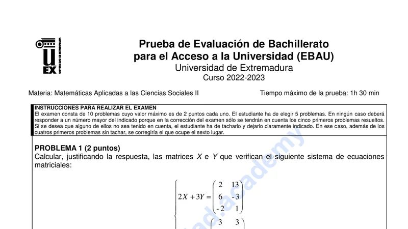 Examen PAU Matemáticas CCSS selectividad Extremadura — Ordinaria 2023