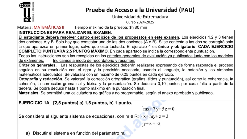 Examen PAU Matemáticas II selectividad Extremadura — Extraordinaria 2025