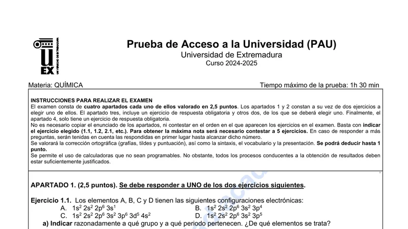 Reservar clase gratis →Examen de Química selectividad Extremadura (Ordinaria 2025)