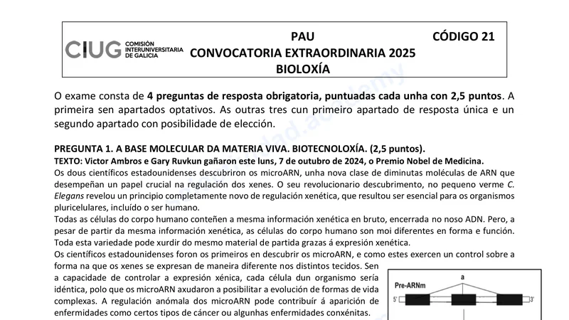 Examen PAU Biología selectividad Galicia — Extraordinaria 2025