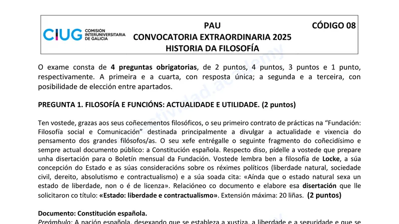 Examen PAU Filosofía selectividad Galicia — Extraordinaria 2025
