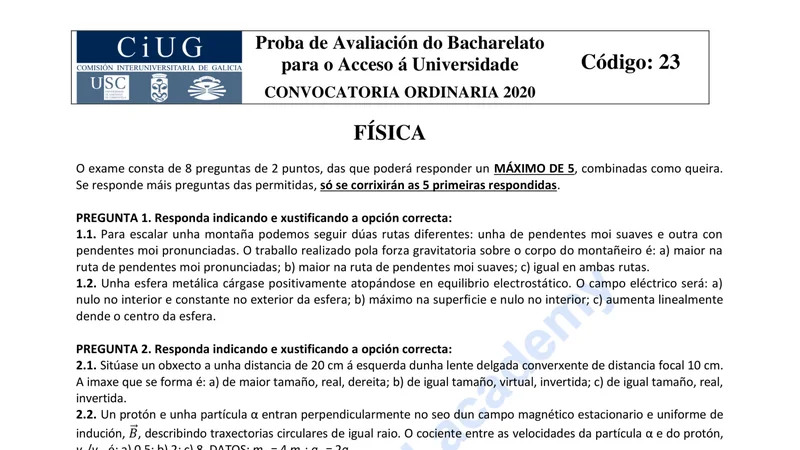 Examen PAU Física selectividad Galicia — Ordinaria 2020
