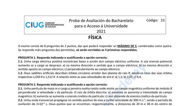 Enunciado oficial del examen de Física de la convocatoria ordinaria de 2021 de la ABAU/PAU de Galicia. PDF de 2.0 MB. Descarga gratuita y sin registro. ¿Preparando la selectividad? Calcula tu nota estimada o consulta la guía completa de selectividad 2026. Encuentra todos los exámenes de Física en Galicia o explora las 17 comunidades autónomas.