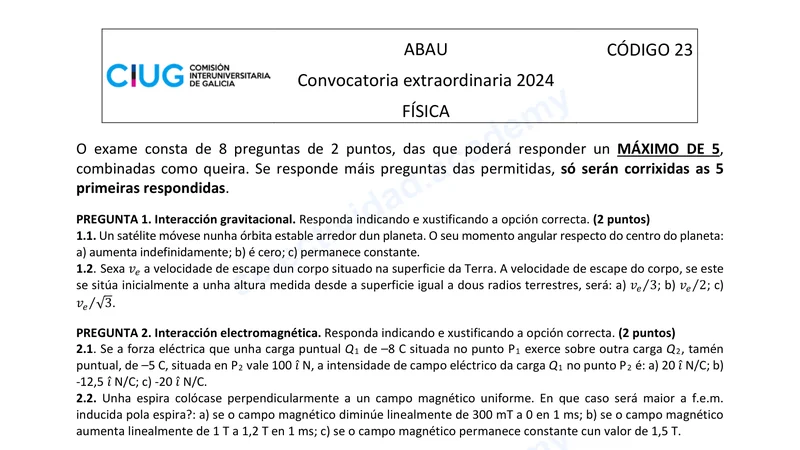 Enunciado oficial del examen de Física de la convocatoria extraordinaria de 2024 de la ABAU/PAU de Galicia. PDF de 0.2 MB. Descarga gratuita y sin registro. ¿Preparando la selectividad? Calcula tu nota estimada o consulta la guía completa de selectividad 2026. Encuentra todos los exámenes de Física en Galicia o explora las 17 comunidades autónomas.