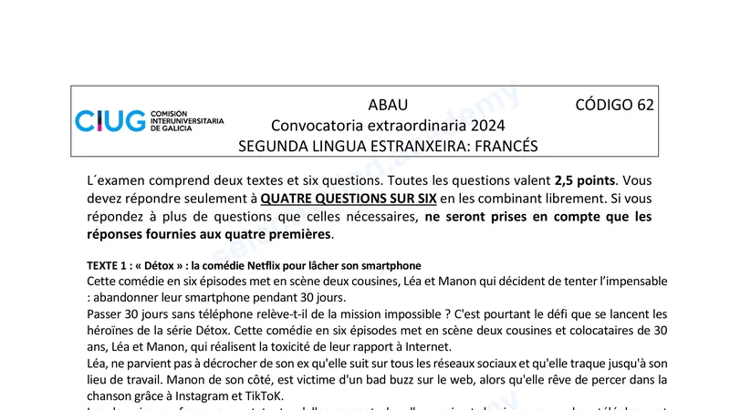 Examen PAU Francés selectividad Galicia — Extraordinaria 2024