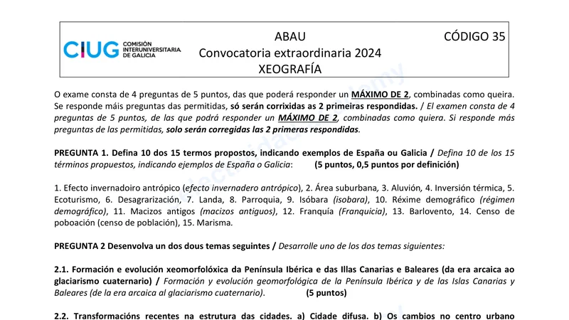 Examen PAU Geografía selectividad Galicia — Extraordinaria 2024