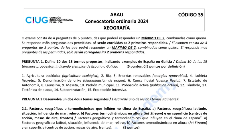 Examen PAU Geografía selectividad Galicia — Ordinaria 2024