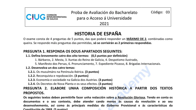 Examen PAU Historia de España selectividad Galicia — Ordinaria 2021