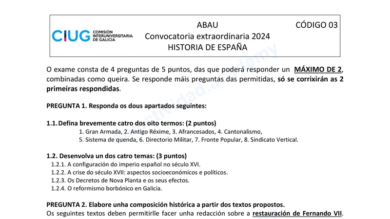 Examen PAU Historia de España selectividad Galicia — Extraordinaria 2024