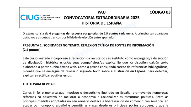 Reservar clase gratis →Examen de Historia de España selectividad Galicia (Extraordinaria 2025)