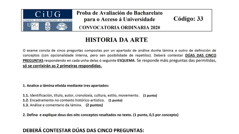 Examen PAU Historia del Arte selectividad Galicia — Ordinaria 2020