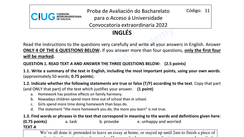 Enunciado oficial del examen de Inglés de la convocatoria extraordinaria de 2022 de la ABAU/PAU de Galicia. PDF de 0.4 MB. Descarga gratuita y sin registro. ¿Preparando la selectividad? Calcula tu nota estimada o consulta la guía completa de selectividad 2026. Encuentra todos los exámenes de Inglés en Galicia o explora las 17 comunidades autónomas.