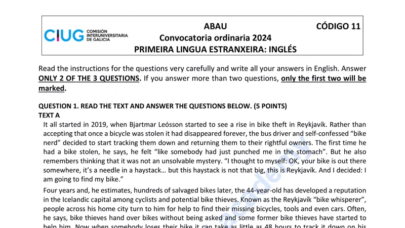 Enunciado oficial del examen de Inglés de la convocatoria ordinaria de 2024 de la ABAU/PAU de Galicia. PDF de 0.1 MB. Descarga gratuita y sin registro. ¿Preparando la selectividad? Calcula tu nota estimada o consulta la guía completa de selectividad 2026. Encuentra todos los exámenes de Inglés en Galicia o explora las 17 comunidades autónomas.