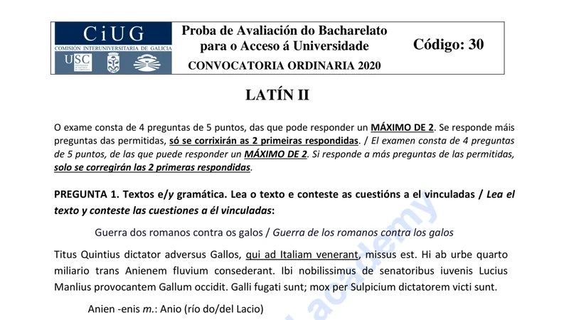 Examen PAU Latín II selectividad Galicia — Extraordinaria 2020