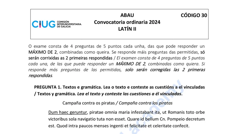 Examen PAU Latín II selectividad Galicia — Ordinaria 2024