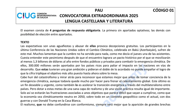 Examen PAU Lengua Castellana selectividad Galicia — Extraordinaria 2025