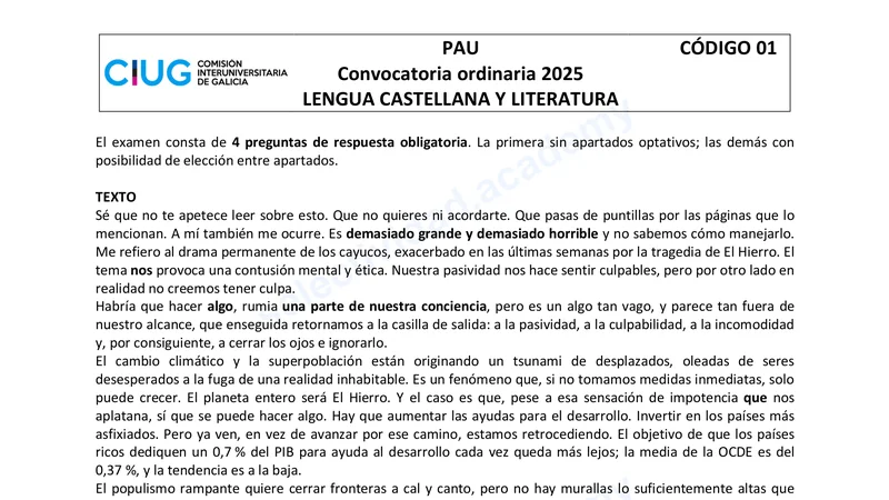 Examen PAU Lengua Castellana selectividad Galicia — Ordinaria 2025