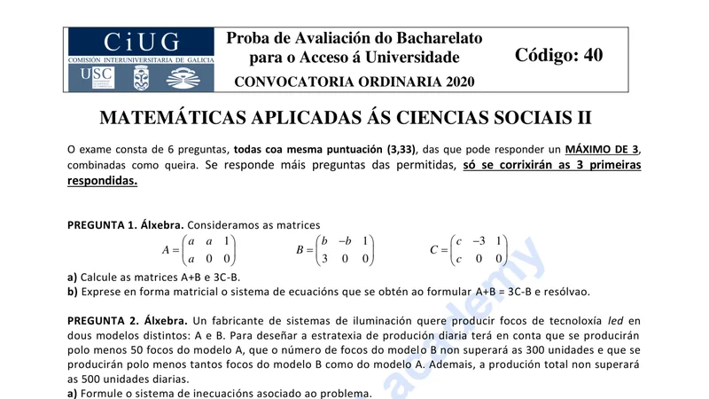 Examen PAU Matemáticas CCSS selectividad Galicia — Ordinaria 2020