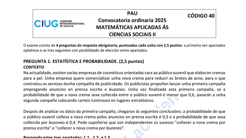 Examen PAU Matemáticas CCSS selectividad Galicia — Ordinaria 2025
