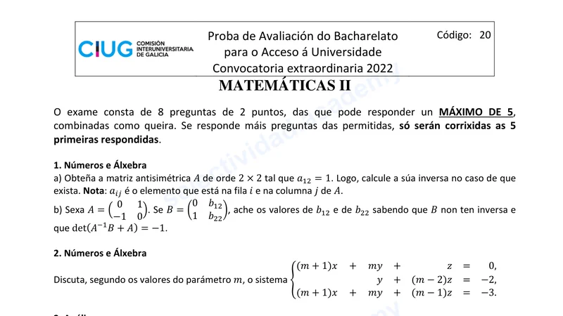Examen de Matemáticas II selectividad Galicia — Extraordinaria 2022