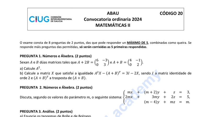Reservar clase gratis →Examen de Matemáticas II selectividad Galicia (Ordinaria 2024)