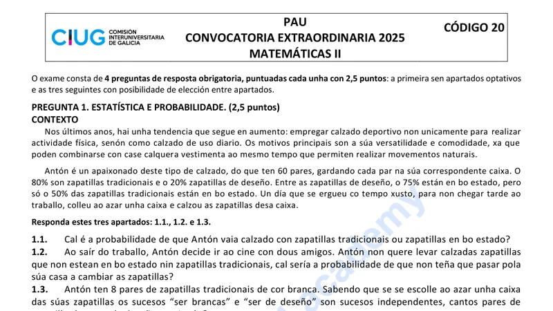 Enunciado oficial del examen de Matemáticas II de la convocatoria extraordinaria de 2025 de la ABAU/PAU de Galicia. PDF de 0.2 MB. Descarga gratuita y sin registro. ¿Preparando la selectividad? Calcula tu nota estimada o consulta la guía completa de selectividad 2026. Encuentra todos los exámenes de Matemáticas II en Galicia o explora las 17 comunidades autónomas.