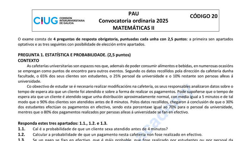 Enunciado oficial del examen de Matemáticas II de la convocatoria ordinaria de 2025 de la ABAU/PAU de Galicia. PDF de 0.1 MB. Descarga gratuita y sin registro. ¿Preparando la selectividad? Calcula tu nota estimada o consulta la guía completa de selectividad 2026. Encuentra todos los exámenes de Matemáticas II en Galicia o explora las 17 comunidades autónomas.