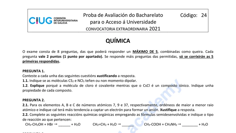 Examen PAU Química selectividad Galicia — Extraordinaria 2021