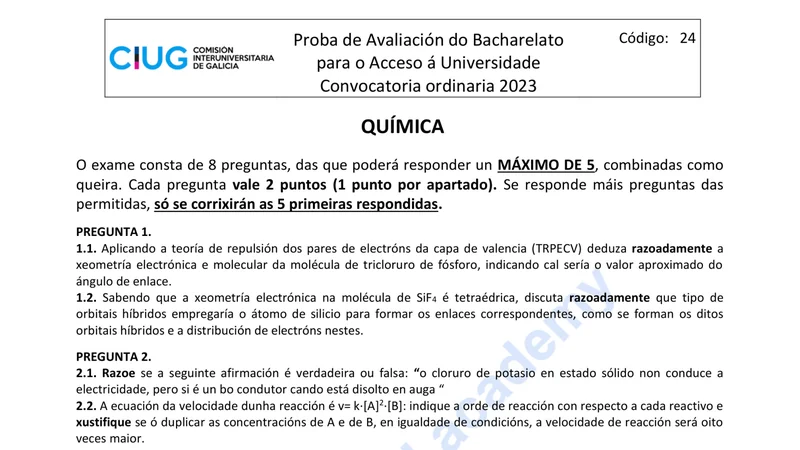 Reservar clase gratis →Examen de Química selectividad Galicia (Ordinaria 2023)