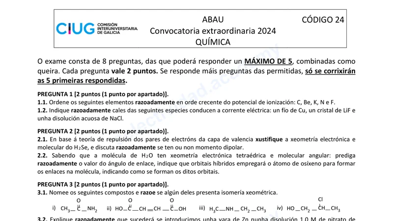 Examen PAU Química selectividad Galicia — Extraordinaria 2024