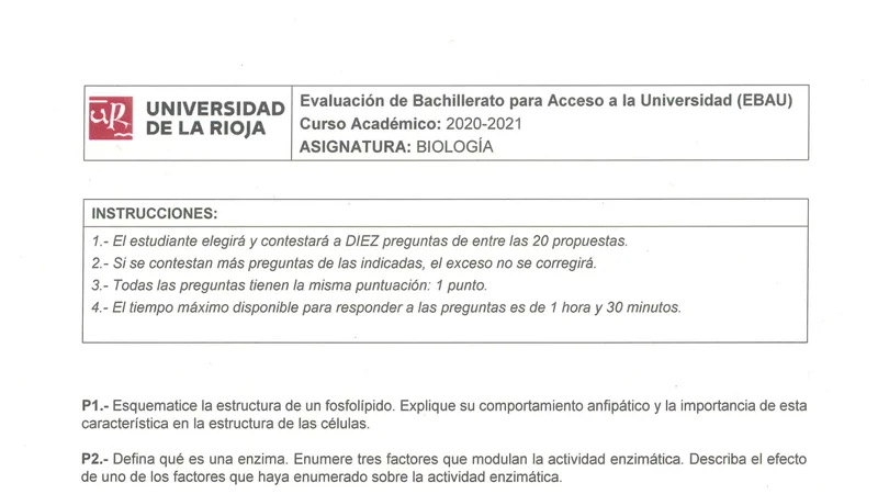 Examen PAU Biología selectividad La Rioja — Extraordinaria 2021