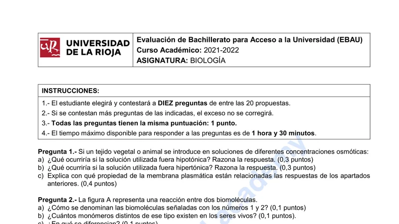 Reservar clase gratis →Examen de Biología selectividad La Rioja (Extraordinaria 2022)